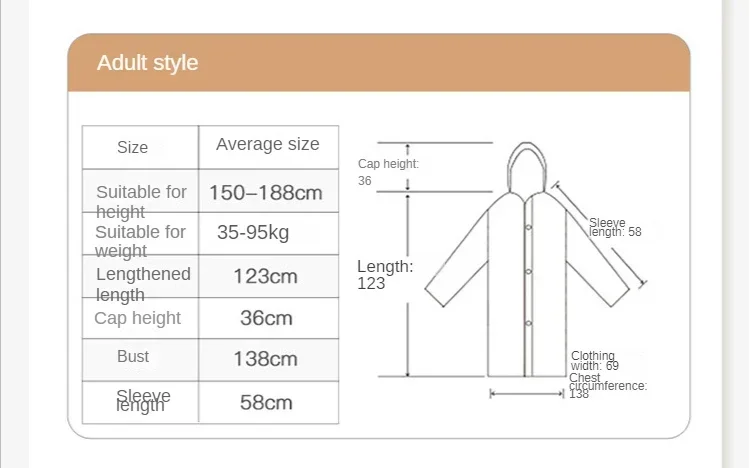 Adult models are suitable for adults or older children with height. Length 123cm, cap height 36cm, chest circumference 138cm, sleeve length 58cm.